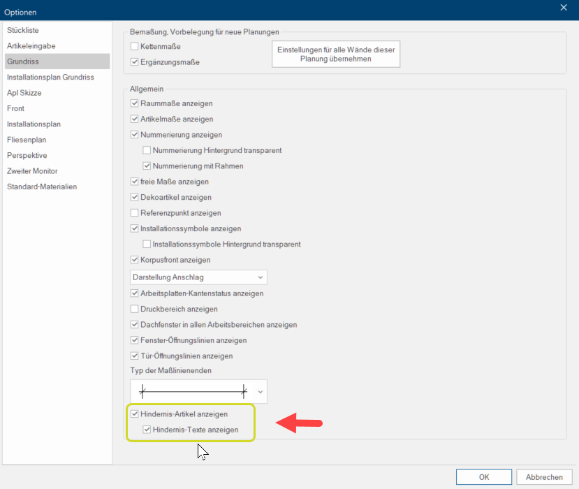 Die bisher im Arbeitsbereich Da sich bei einer Planung die Bereiche im Grundriss häufig überschneiden (z.B. Sockel, Arbeitsplatte, Korpus etc.) wurden diese Artikelgruppen in Arbeitsbereiche eingeteilt. Artikelmaße im Grundriss ausgeblendeten Hindernis-Artikel und Hindernis-Texte können jetzt eingeblendet werden. Dazu müssen in den Ansichtsoptionen unter Grundriss die Optionen Das Wort Option (v. lat.: optio = freier Wille) bezeichnet in der Informatik eine Auswahlmöglichkeit. In unserem Fall handelt es sich dabei immer um die runden Auswahlfelder. Hindernis-Artikel anzeigen und Hindernis-Texte anzeigen aktiviert sein. |