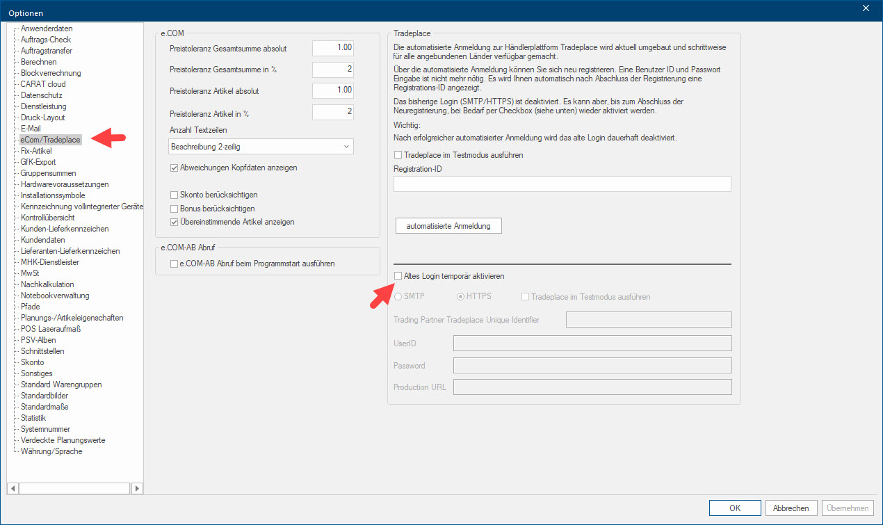 Um den aktualisierten Zugang zu Tradeplace mit CARAT nutzen zu können, ist es notwendig, dass sich bereits angemeldete Nutzer ab der CARAT Version V2025.4.01 über die automatisierte Anmeldung neu registrieren. Neuanmeldungen sind aktuell nur noch mit CARAT Versionen ab V2025.4.0.1 möglich.