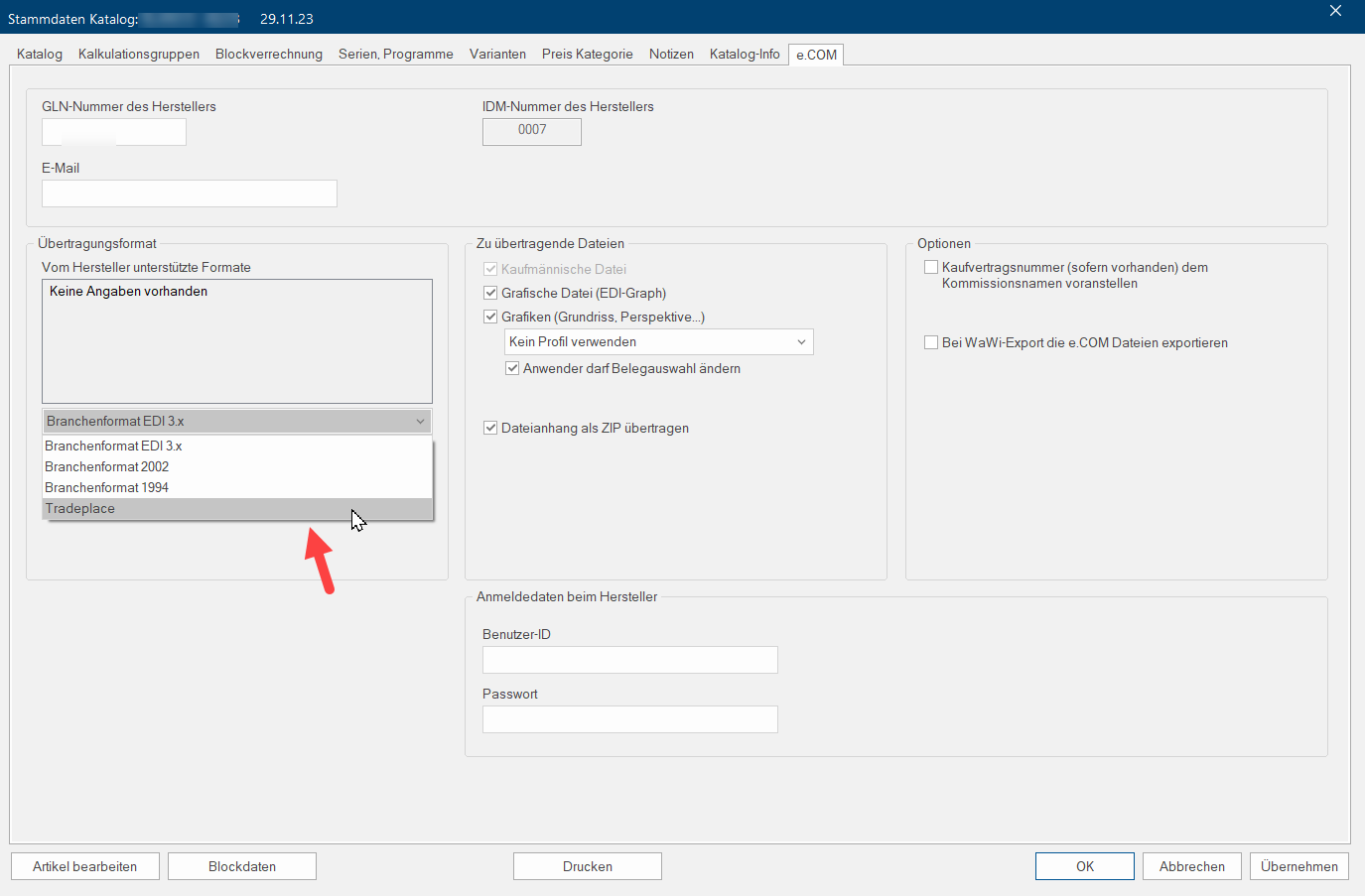 Als letzten Schritt wählen Sie dann für die jeweiligen Kataloge in den Stammdaten Katalog im Register e.COM das Übertragungsformat Tradeplace aus. Wenn Sie bereits mit der alten Anmeldung über Tradeplace bestellt haben, entfällt dieser Schritt.