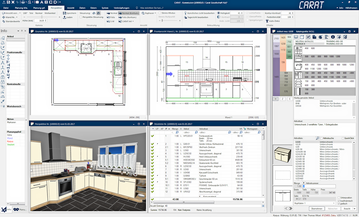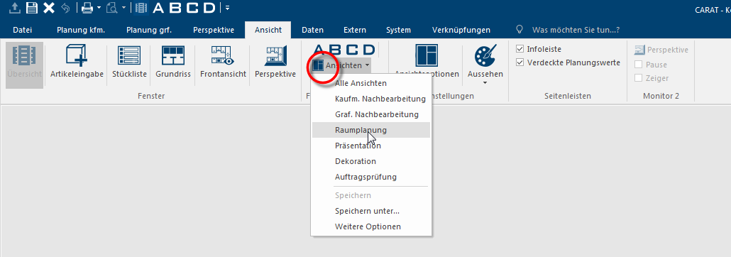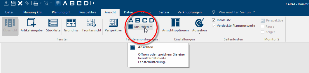 Wenn Sie eine Planung mit CARAT bearbeiten werden Sie in der Regel unterschiedliche Abschnitte, wie beispielsweise die Raumplanung, die Küchenplanung, die Angebotsbearbeitung oder auch die Erstellung einer 3D-Ansicht durchlaufen. Für jede dieser Anforderungen werden unterschiedliche Ansichten, sogenannte Fenster, benötigt, die im Bereich der Arbeitsfläche von CARAT angezeigt werden. Siehe auch: Die Oberfläche von CARAT