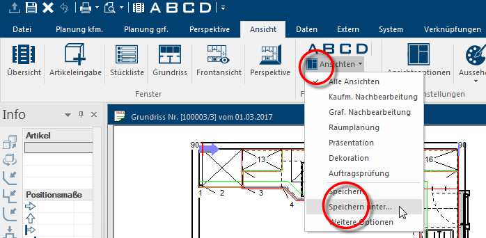 Über das Symbol C wird der Grundriss, die Frontansicht, sowie die Artikeleingabe geöffnet. Bei dieser Fensteraufteilung erhält der Grundriss den größten Platz auf der Arbeitsfläche, da diese Aufteilung speziell für die grafische Planung vorgesehen ist. Durch die zusätzliche Darstellung der Frontansicht und der Artikeleingabe können Sie alle Informationen, die Sie zur grafischen Planung benötigen, jederzeit im Blick behalten. |