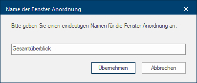 - Daraufhin können Sie eine aussagefähigen Bezeichnung eingeben. Zunächst wird Ihnen dazu in dem Textfeld für die Bezeichnung als Vorschlag eine Kombination der verwendeten Fenstertitel angezeigt. Sobald Sie auf die Schaltfläche In einem Dialogfenster finden Sie immer eine oder mehrere Schaltflächen, die durch Klicken aktiviert werden können. Typische Aktionen für eine Schaltfläche sind z.B. OK, Abbrechen, übernehmen. Schaltflächen werden immer mit einem einfachen Klick mit der linken Maustaste betätigt. Übernehmen klicken, wird die Fensteranordnung unter der von Ihnen eingegebenen Bezeichnung gespeichert.