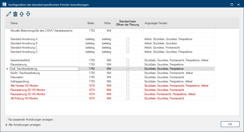 - In der obersten Zeile des Dialogs können Sie immer die aktuelle Größe der CARAT-Arbeitsfläche, Breite und Höhe in Pixel, ablesen. Darunter werden die vier Standard-Anordnungen aufgeführt. Unterhalb der Standard-Anordnungen werden alle benutzerdefinierten Fensteranordnungen aufgelistet. Sofern Sie auf dem Dialog unten links die Option Alle Anordnungen anzeigen ausgewählt haben, werden Ihnen hier auch die Fensteranordnungen angezeigt (in roter Schrift), die nicht mit der aktuellen Größe der Arbeitsfläche erstellt wurden.