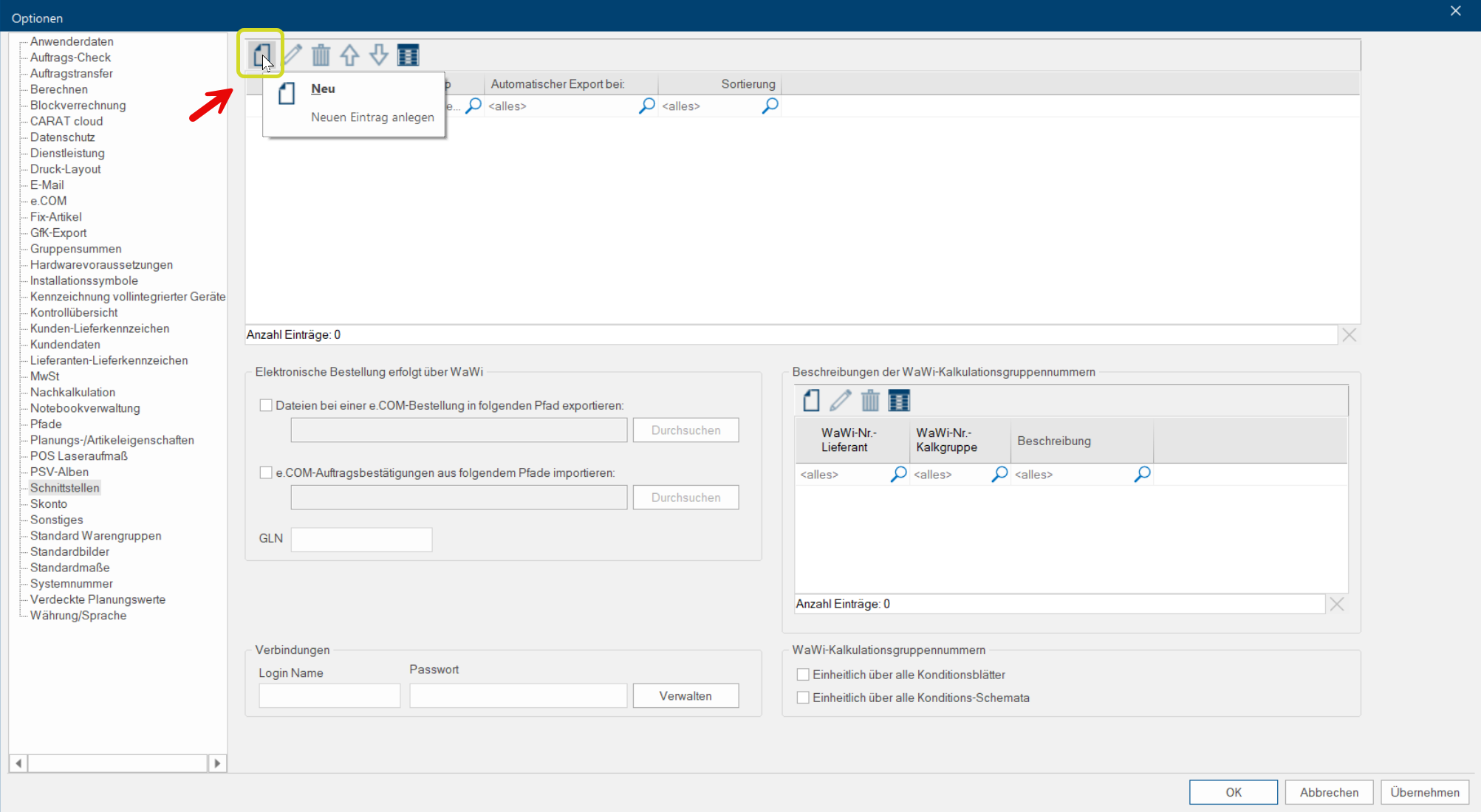 Öffnen Sie in der Menüleiste im Register Manche Dialogfenster sind so umfangreich, dass die Funktionen in Unterbereiche geteilt werden. Diese Unterbereiche werden meist im oberen Bereich des Dialogs angezeigt und können durch Klicken auf den entsprechenden Text erreicht werden. System die Systemoptionen und dort die Seite Schnittstellen. Dann klicken Sie auf Symbol Neu