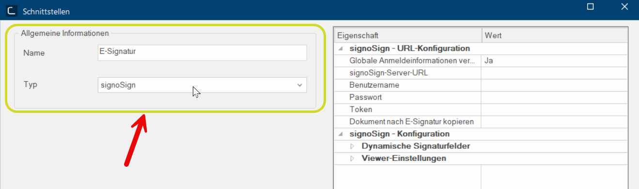 Vergeben Sie dann im Dialog Als Dialog oder Dialogfenster, Dialogfeld, bezeichnet man spezielle Fenster in Software- anwendungen. Dialogfenster werden in verschiedenen Situationen von der Anwendung eingeblendet, um bestimmte Eingaben oder Bestätigungen vom Benutzer einzuholen. Schnittstellen unter Allgemeine Informationen einen passenden Namen, zum Beispiel E-Signatur und wählen Sie dann als Typ signoSign aus.