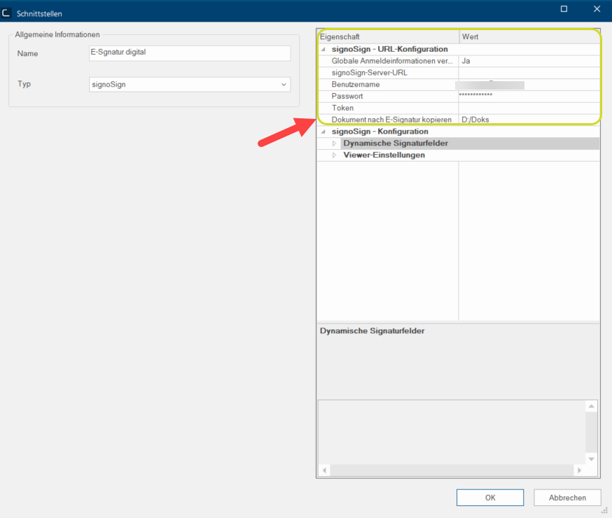 Hinterlegen Sie unter signoSign - URL-Konfiguration in den Feldern Benutzername und Passwort die Anmeldeinformationen, die Sie von signotec erhalten haben. Im Feld Dokument nach E-Signatur kopieren können Sie optional einen Pfad In einem hierarchisch organisierten Dateisystem ist ein Pfad die Abfolge von Verzeichnissen, die durchlaufen werden müssen, um von einer bestimmten Stelle im Dateisystem aus zu einer bestimmten Datei zu kommen, beispielsweise C:\mustermann\briefe\Geschäftsbriefe oder c:\Dokumente\Eigene Dateien\Geschäftsbriefe. hinterlegen um die E-Signaturen abzuspeichern.