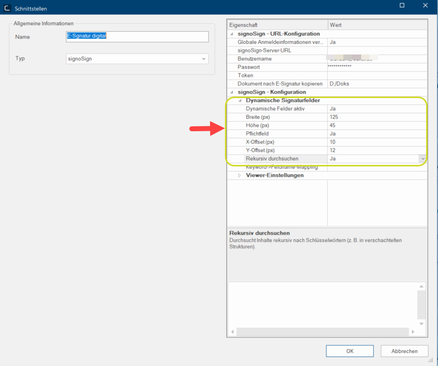 Durch Auswahl Ja im Feld Rekursiv durchsuchen wird ein Signaturfeld an jede Stelle des Dokuments gesetzt, wo die vorgegebenen Keywörter vorkommen. Bei Nein erscheint das Signaturfeld nur beim ersten Vorkommen der Keywörter.