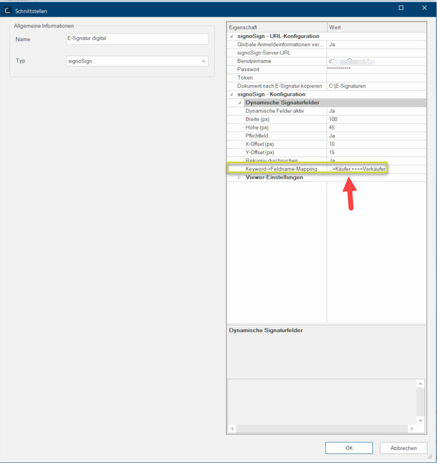 Im Feld Keyword->Feldname-Mapping legen Sie eine Bezeichnung (Feldnamen), zum Beispiel ... für das jeweilige gewünschte Signaturfeld fest und verknüpfen dieses mit einem Schlüsselwort (Keyword) zum Beispiel Käufer.