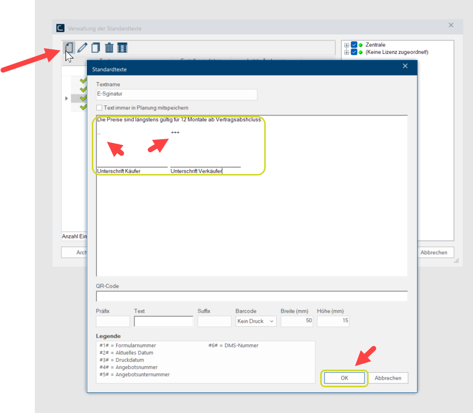 Vergeben Sie nun einen Textnamen für die E-Signatur und Erfassen einen Standardtext darunter tippen Sie dann die hinterlegten Feldnamen, danach bitte mit Klick OK speichern.