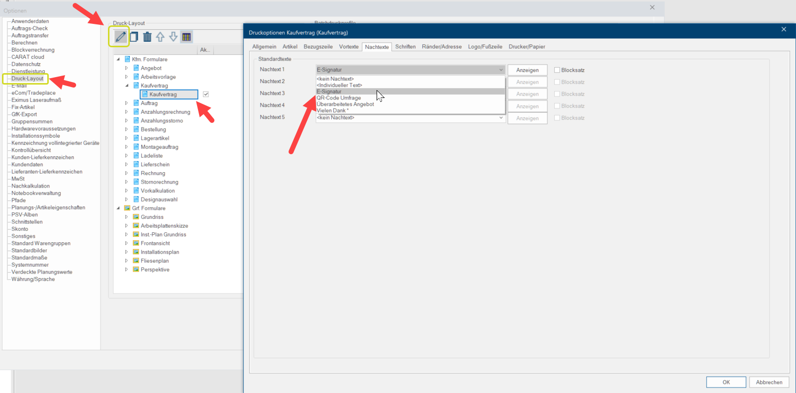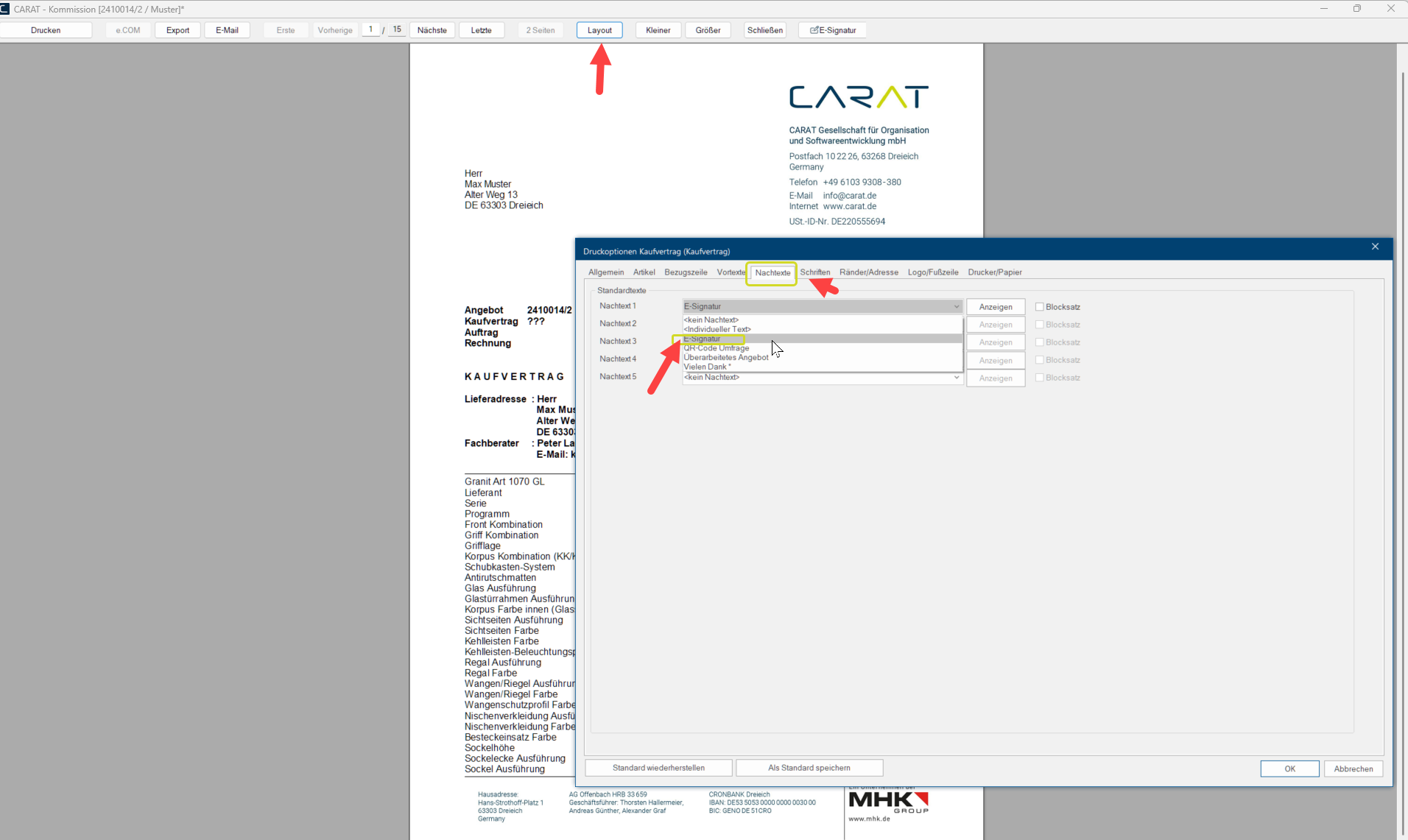 Diesen Standardtext können Sie dann in den Systemoptionen im Druck-Layout zum Beispiel in den Druckoptionen Kaufvertrag als Standardtext unter Nachtexte einfügen oder beim Drucken in der Druckvorschau nach Klick auf Layout individuell auswählen.