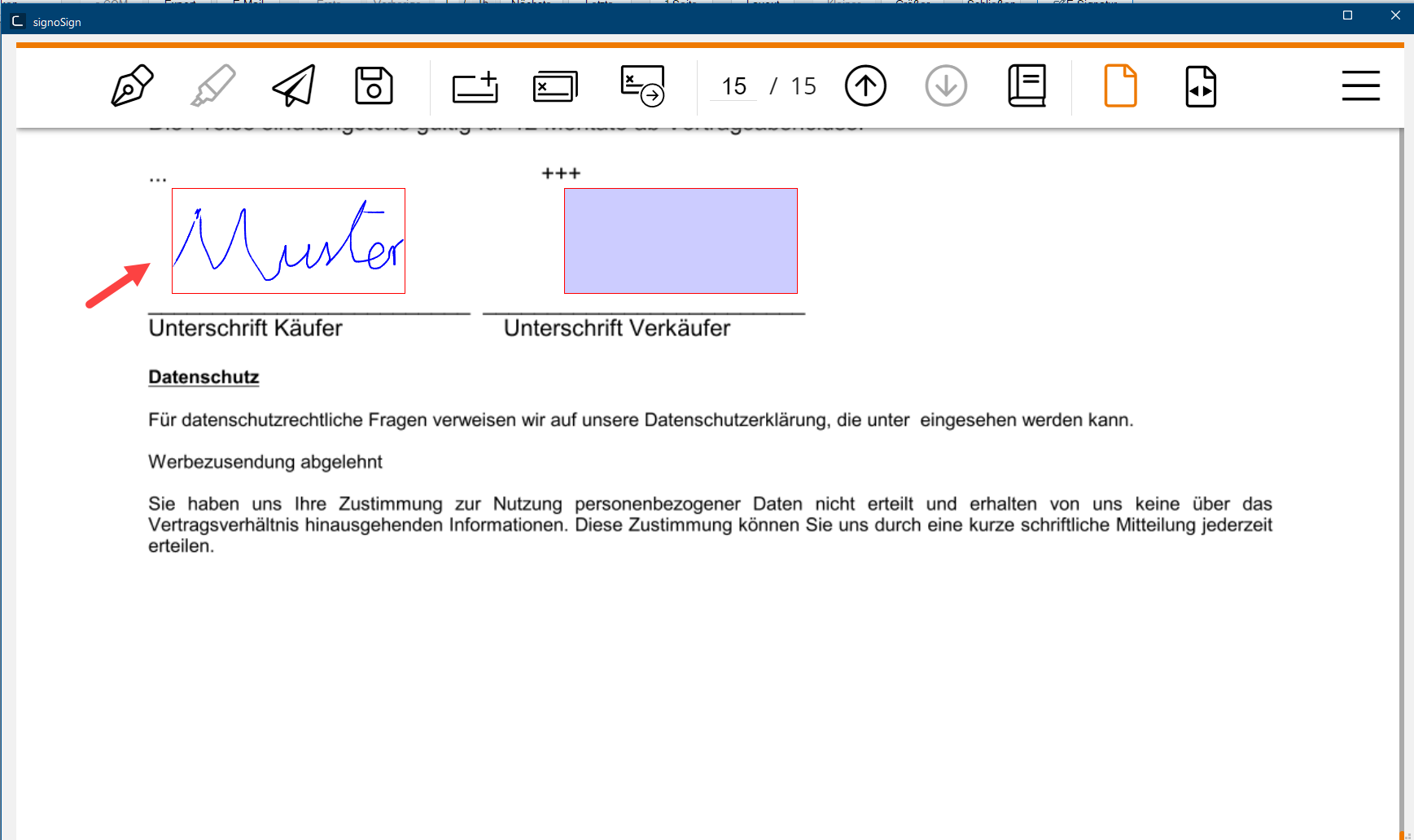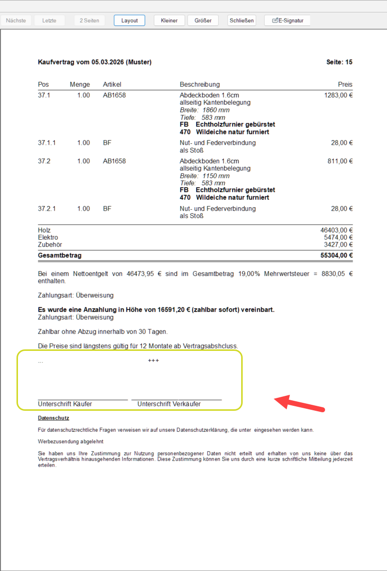 Nach Öffnen der Druckvorschau wechseln Sie zur letzten Seite des Kaufvertrages und wählen, wie zuvor gezeigt, den angelegten Nachtext E-Signatur aus. Es wird jetzt der angelegte Nachtext mit den für die E-Signatur angelegten Sonderzeichen (Keywörtern) dem PDF hinzugefügt.
