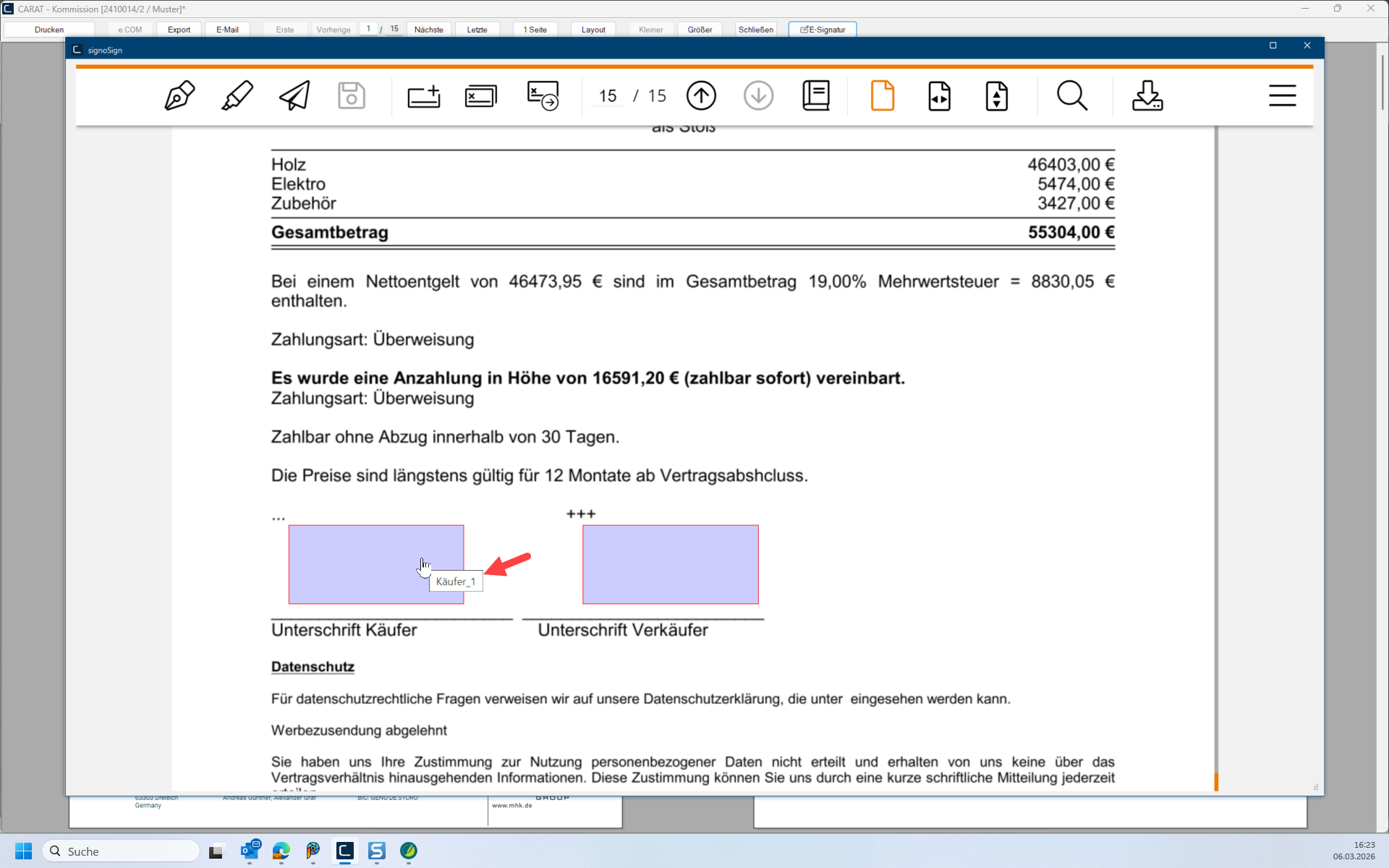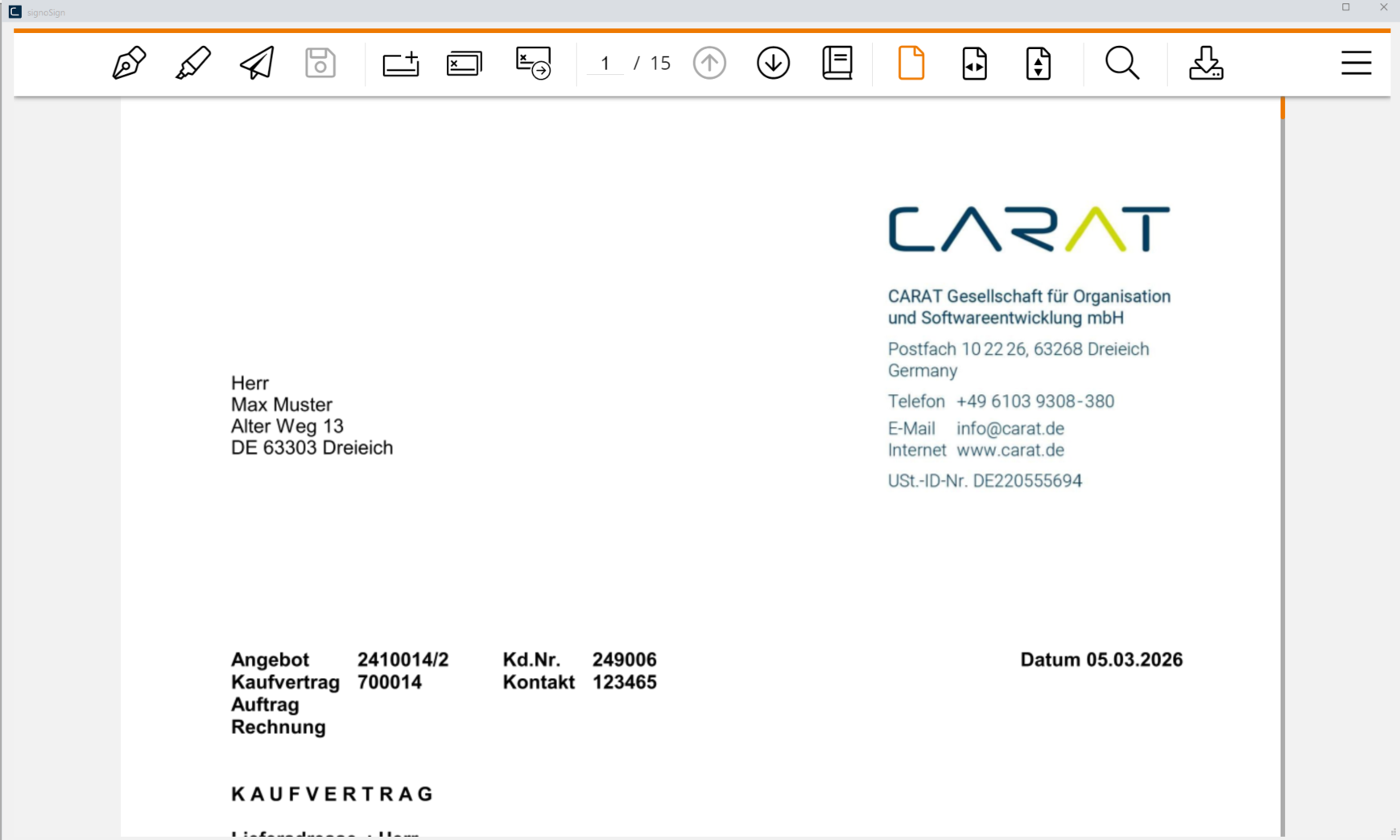 In Zusammenarbeit mit dem Unternehmen signotec GmbH bietet Ihnen CARAT ab der Version V2025.4.0.0 die Möglichkeit digitale Unterschriften mittels Signaturpads, Maus, QR-Code oder Click to sign Tastaturunterschrift auf Ihre erzeugten Dokumente zu übernehmen.