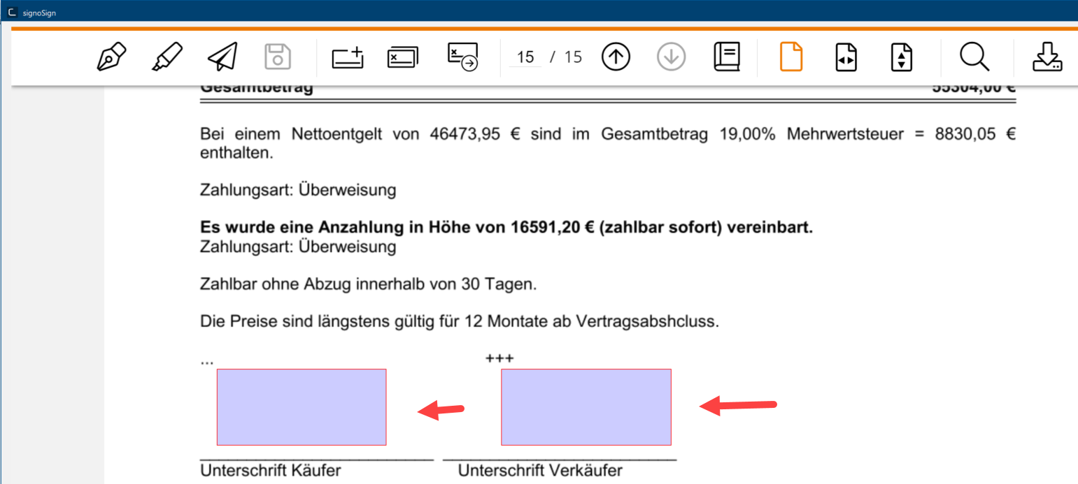 Unterhalb der Sonderzeichen, die als Keywörter hinterlegt sind, sollen gleich die E-Signaturen in den Beleg integriert werden. Dazu klicken Sie oberhalb des PDF Dokuments in der Druckvorschau auf die Schaltfläche In einem Dialogfenster finden Sie immer eine oder mehrere Schaltflächen, die durch Klicken aktiviert werden können. Typische Aktionen für eine Schaltfläche sind z.B. OK, Abbrechen, übernehmen. Schaltflächen werden immer mit einem einfachen Klick mit der linken Maustaste betätigt. E-Signatur.Nun öffnet sich der signoSign Dialog