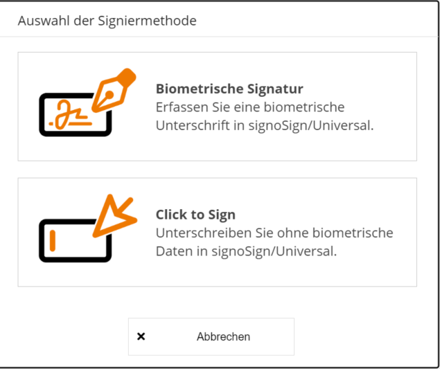 Sie können zwischen 2 digitalen Signiermethoden auswählen, der biometrischen Signatur und der Click to Sign Signatur. Es ist auch möglich pro Signaturfeld eine andere Signiermethode zu wählen.