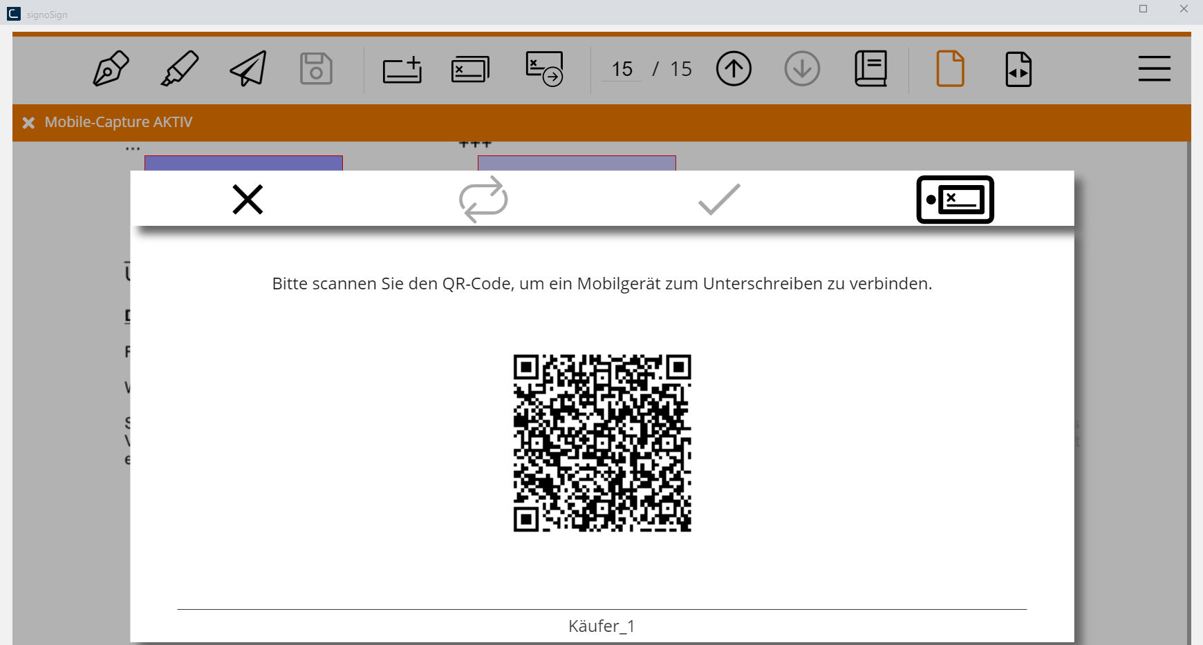 Nach Auswahl biometrische Signatur kann mit Hilfe der gedrückten linken Maustaste,einem Signaturpad oder nach Scannen eines QR-Codes auf einem Handy unterschrieben werden.