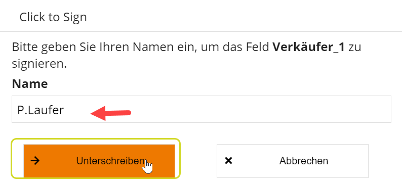 Nach Klick auf Unterschreiben wird dann auf dem Dokument der eingetippte Name in das Signaturfeld als elektronische Signatur eingefügt.