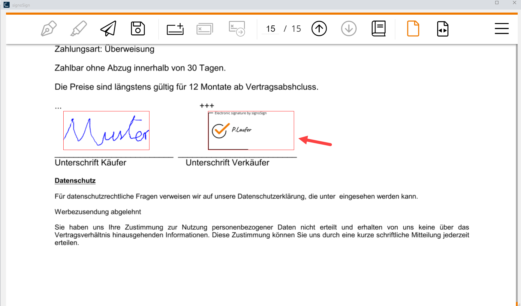 Beispiel letzte Seite der Druckvorschau mit E-Signatur als Nachtext: