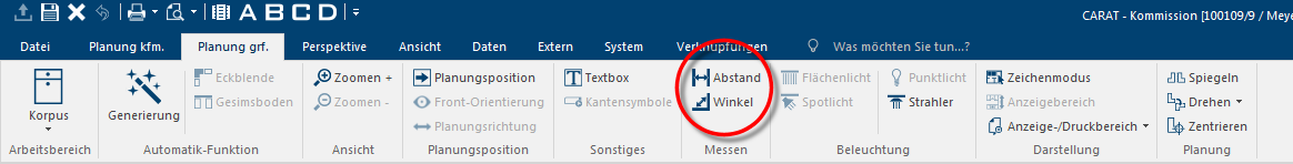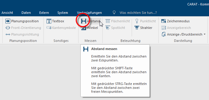 Die Funktionen Abstand können Sie direkt über das Menüband über das Register Manche Dialogfenster sind so umfangreich, dass die Funktionen in Unterbereiche geteilt werden. Diese Unterbereiche werden meist im oberen Bereich des Dialogs angezeigt und können durch Klicken auf den entsprechenden Text erreicht werden. Planung grf. im Bereich Messen aufrufen.