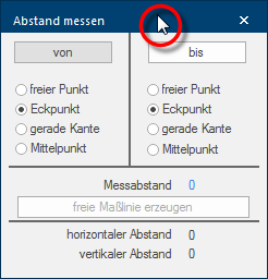 Über diesen Dialog können Sie den Abstand zwischen zwei Messpunkten ermitteln. Dazu ist der Dialog in zwei Bereiche aufgeteilt. Die Art des ersten Messpunkt können Sie im linken Bereich (von) und die Art des zweiten Messpunkts im rechten Bereich (bis) eingeben. Sobald Sie eine Strecke zwischen zwei Messpunkten ermittelt haben, steht Ihnen auch die Schaltfläche freie Maßlinie erzeugen zur Verfügung, um aus der gemessenen Strecke eine Maßlinie in der Grafik erstellen zu können.