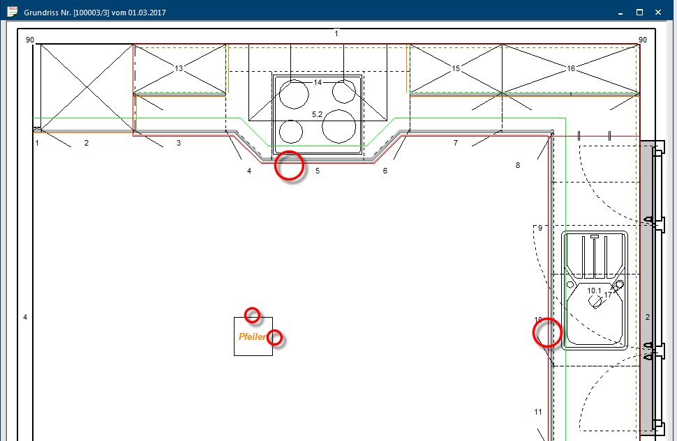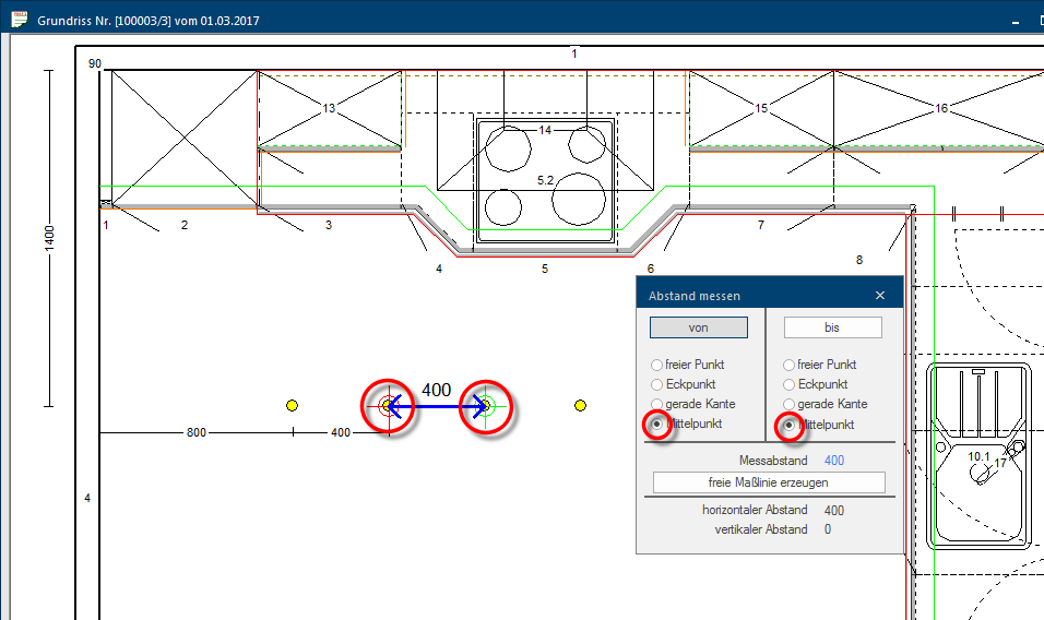 Für viele Objekte wie beispielsweise Korpusartikel, Dekoartikel, Beleuchtungen und Installationssymbole kann bei Bedarf anstelle einer Kante oder einer Ecke auch der Mittelpunkt als Messpunkt verwendet werden. Gerade für Beleuchtungs- oder Installationssymbole bietet sich die Vermaßung bis zum Mittelpunkt des Objekts an.