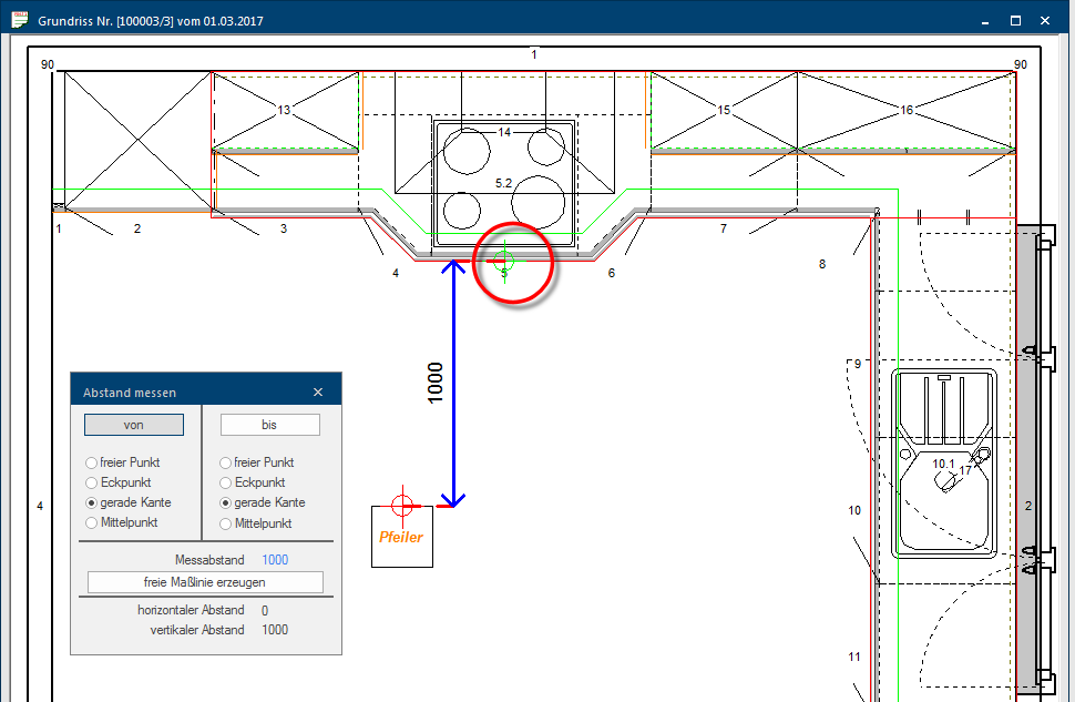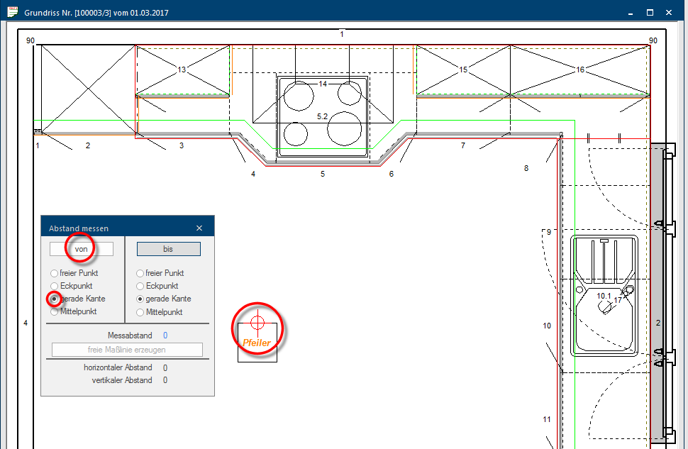 Während einer Planung kann es notwendig sein, einen Abstand zwischen zwei Objekten oder verschiedenen Eckpunkten im Raum exakt abmessen zu können. Speziell bei sehr komplexen Planungen kann es darüber hinaus notwendig werden, zusätzlich zu den automatisch ermittelten Maßlinien auch eigene Maßlinien zu ergänzen. Dafür dienen die Funktionen Abstand.