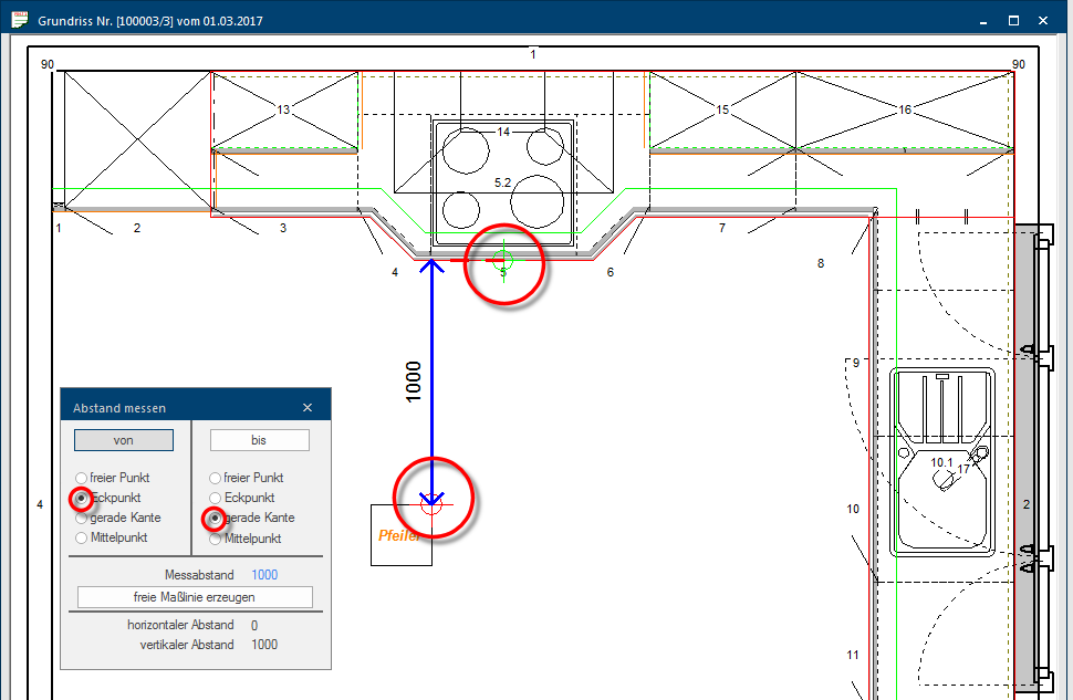- Um den ersten Messpunkt zu setzen, klicken sie dann auf einen der beiden Eckpunkte, zwischen denen Sie den Abstand ermitteln möchten.