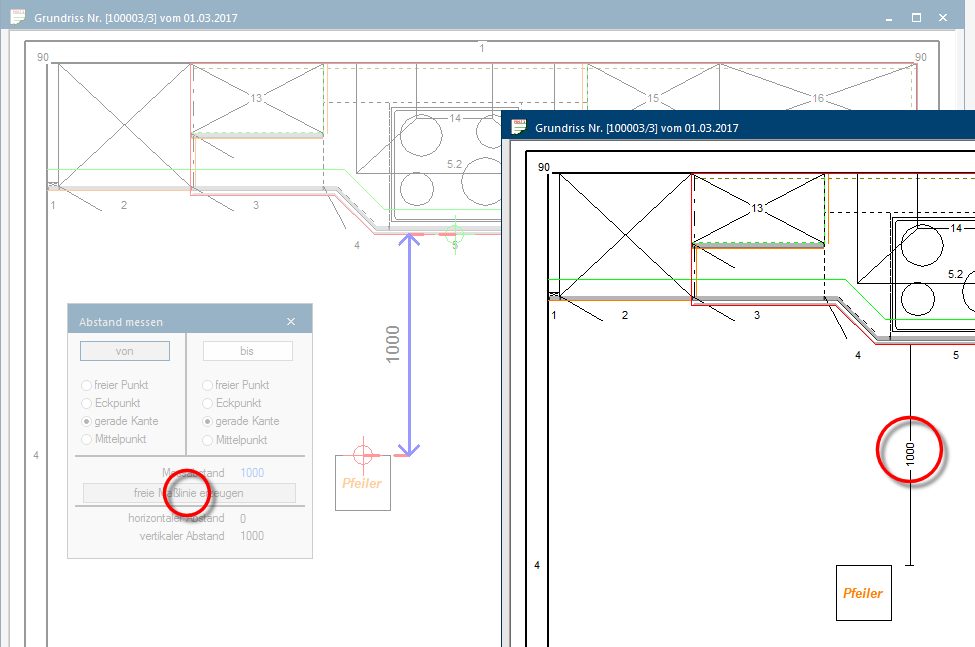 - Bei Bedarf können Sie über die Schaltfläche freie Maßlinie erzeugen eine entsprechende Maßlinie in Ihre Grafik übernehmen. Die Maßlinie wird zunächst an der Stelle eingezeichnet, an der der Abstand gemessen wurde.
