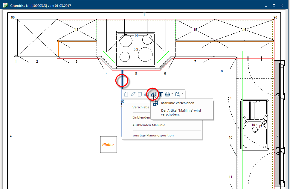 - Die neu eingezeichnete freie Maßlinie kann anschließend über die Funktion Verschieben wie eine automatisch generierte Maßlinie an eine andere Position in der Zeichnung verschoben werden.
