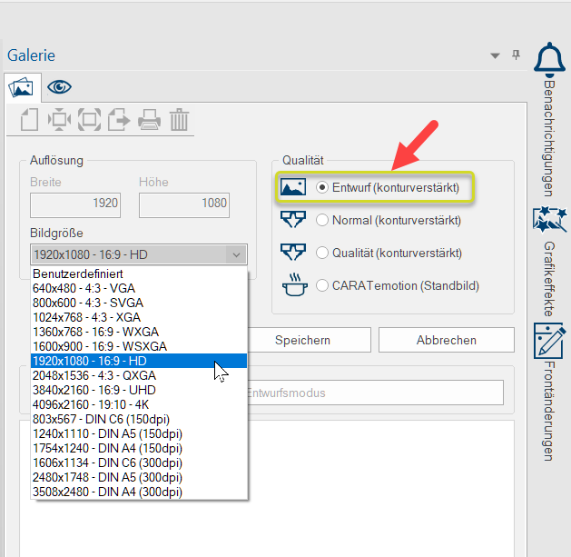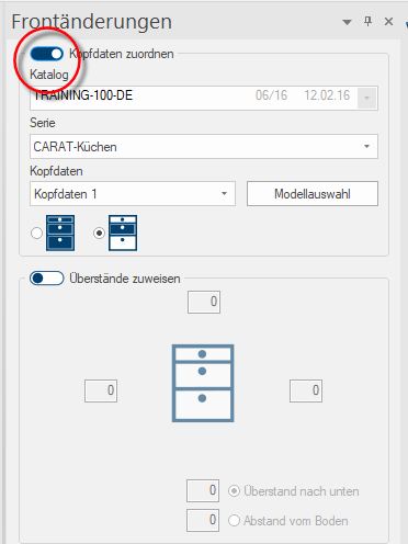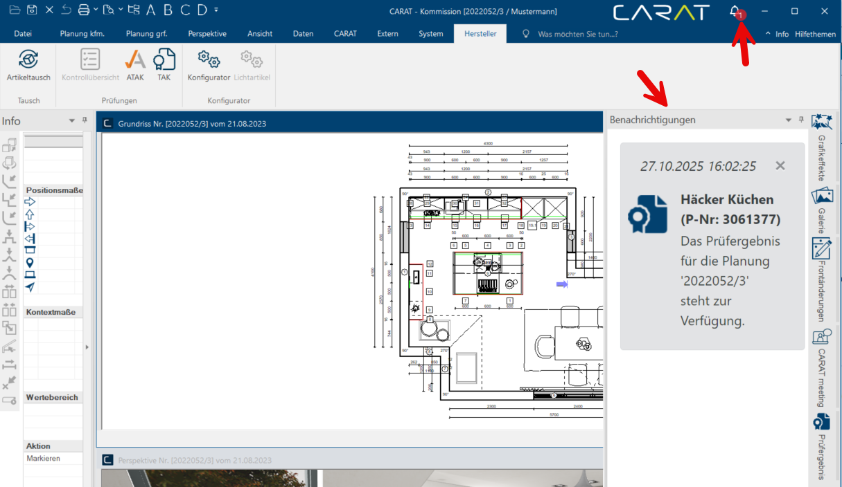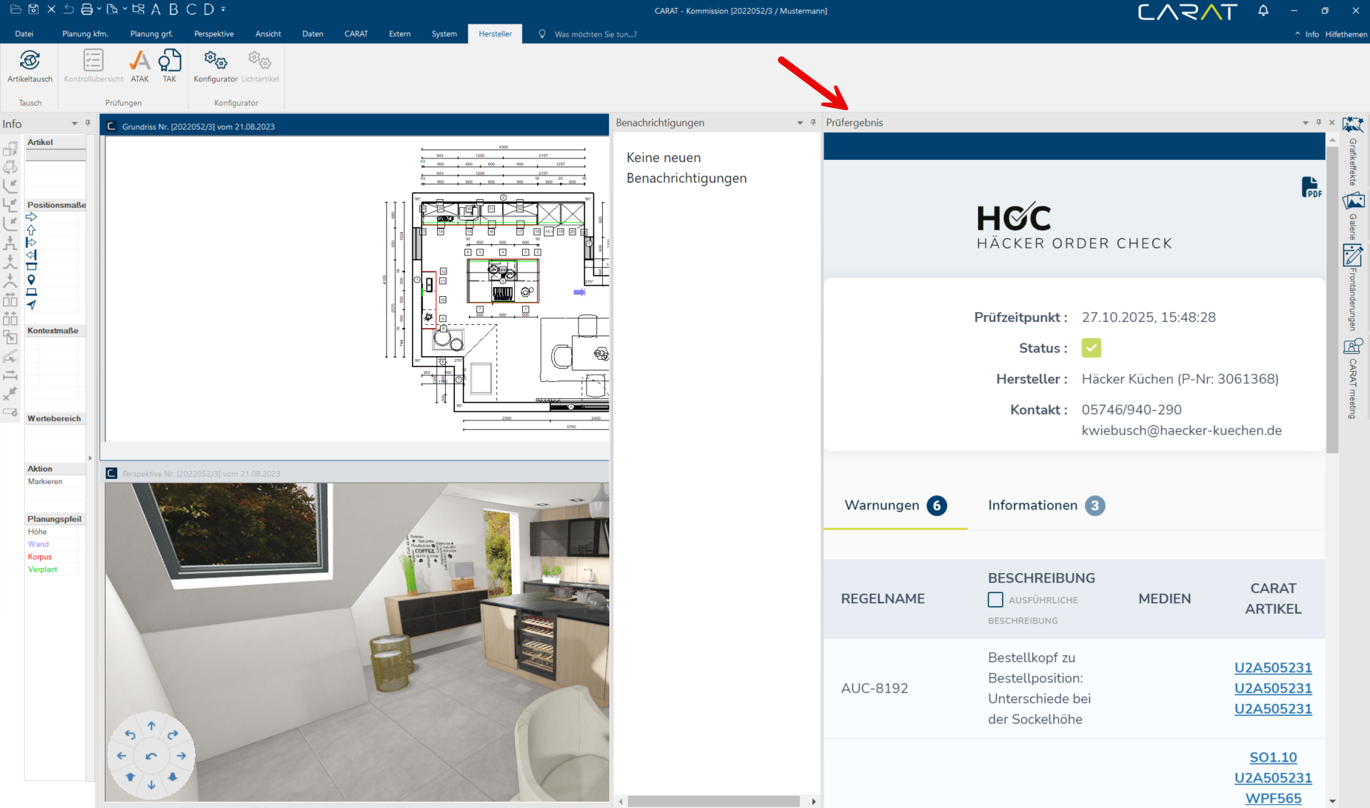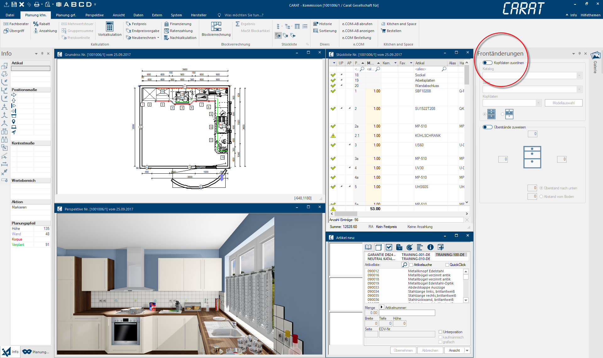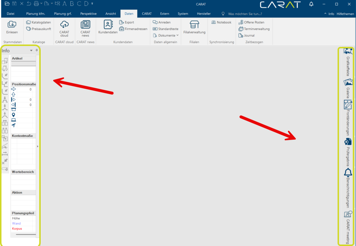 Une fois CARAT ouvert, les zones fonctionnelles, appelées barres latérales ancrables, s'affichent. Il s'agit des barres latérales Info, Valeurs de planification, Galerie, Modifications de façade, Effets graphiques, Notifications et Résultats de contrôle.