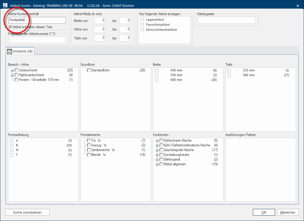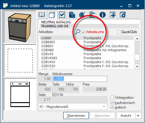 Les différents critères peuvent être utilisés individuellement ou en combinaison pour rechercher un article. Par exemple, vous pouvez rechercher une partie spécifique du numéro d'article ou un terme dans le court texte de l'article. Bien entendu, vous pouvez également rechercher un type d'armoire spécifique, une taille d'armoire, un cloisonnement frontal ou encore une fonction (évier, cuisson, réfrigérateur, ...).