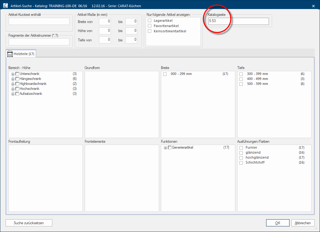 - La partie inférieure de la recherche élargie vous est toujours affichée lorsque le catalogue à déjà été pourvu, par CARAT, d´informations supplémentaires concernant la recherche d´articles. Au dessus de cette partie, des critères de recherches plus amples, en plus des critères de recherche standard, vous sont affichés pour permettre une recherche encore plus ciblée de certains articles et pour filtrer la liste d´articles en conséquence. Si le catalogue comporte différents groupes d'articles (bois, équipements, accessoires, ...), ceux-ci sont regroupés à l'aide de registres appropriés.