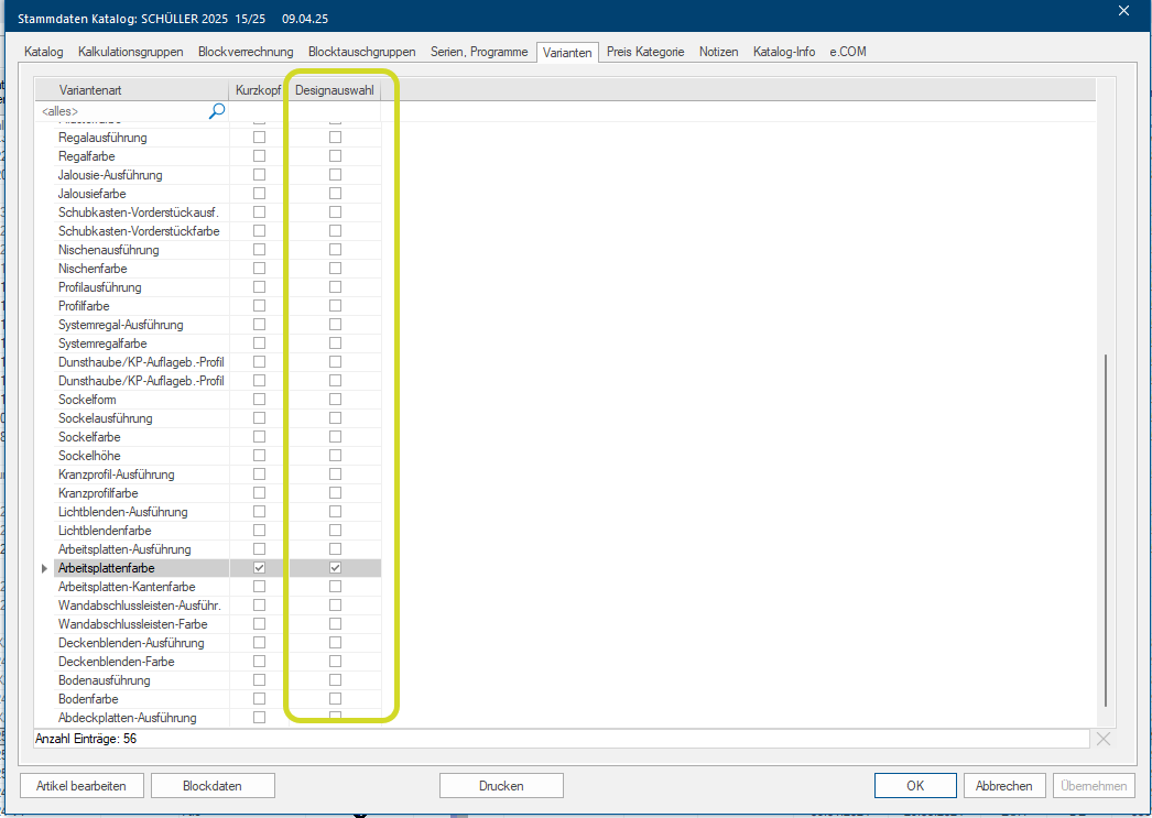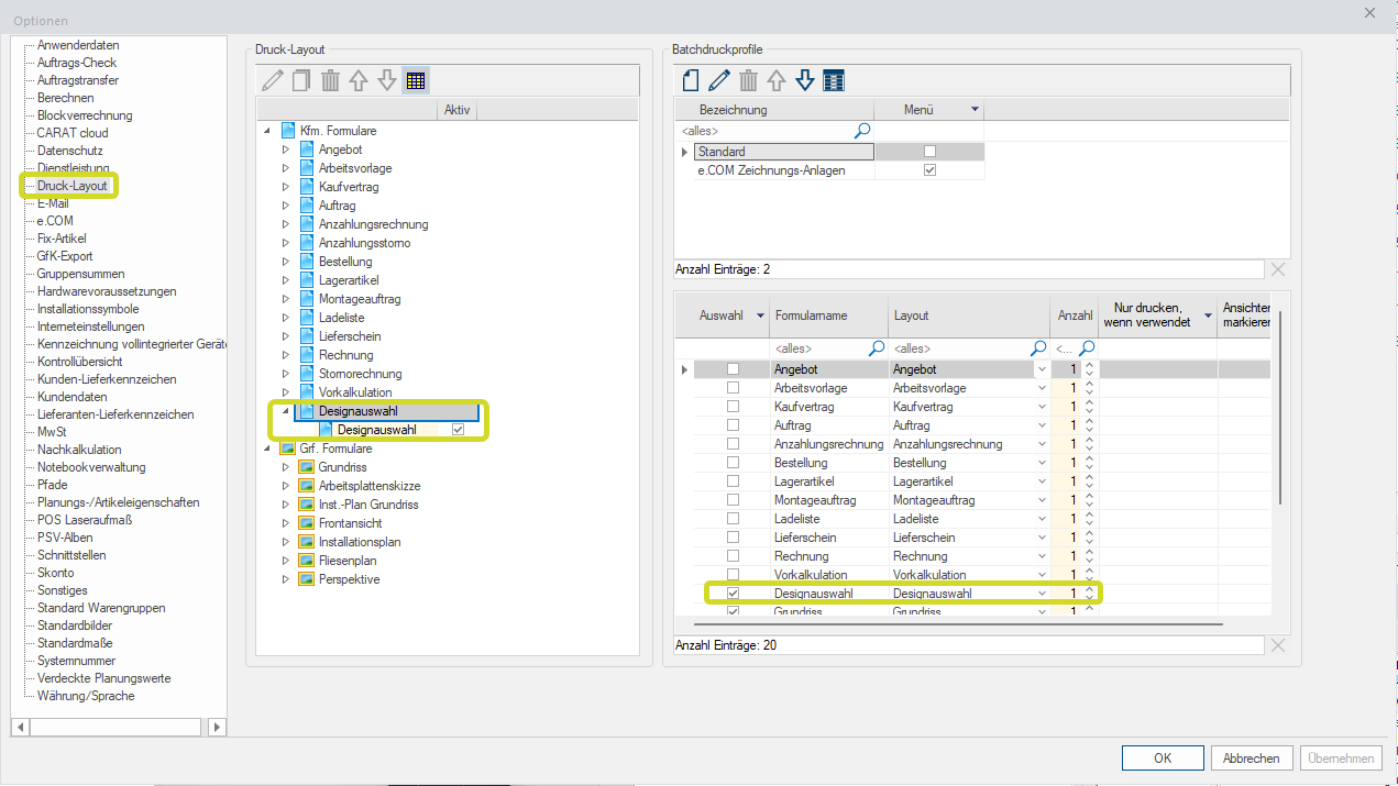 Pour l'utiliser, activez au préalable le choix de design dans les options Le mot option (du latin: optio =volonté libre) désigne dans l´informatique une possibilité de choix. Dans notre cas, il s´agit toujours des champs de sélection ronds. système sous Layout d'impression et sélectionnez les variantes souhaitées dans les données catalogue des fabricants utilisés sous Variantes dans la colonne choix de design.