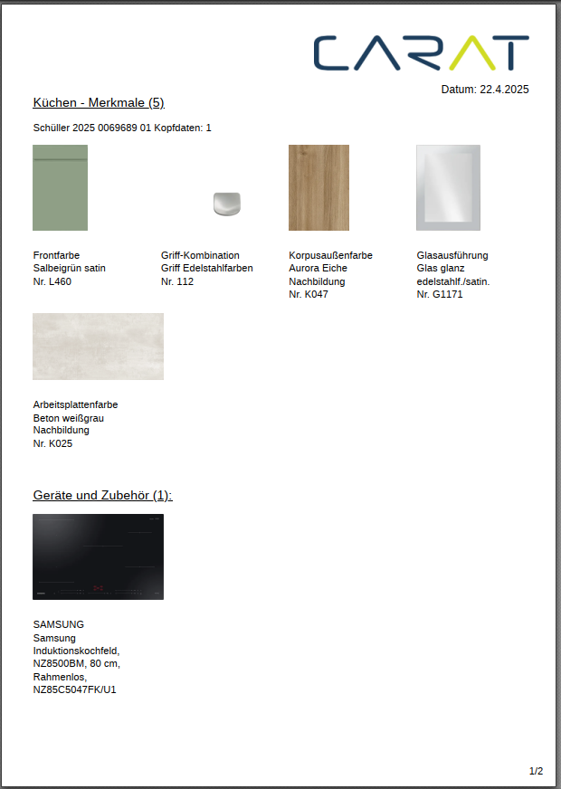 Une fois le choix de design sélectionné, les principales variantes de planification (façade, poignée, plans de travail, socle, verre) et les appareils et éviers prévus sont regroupés dans un document commercial (par exemple, un contrat de vente) sous forme de fichier PDF. Cela permet d'améliorer la traçabilité et d'éviter les malentendus après la consultation et la vente.