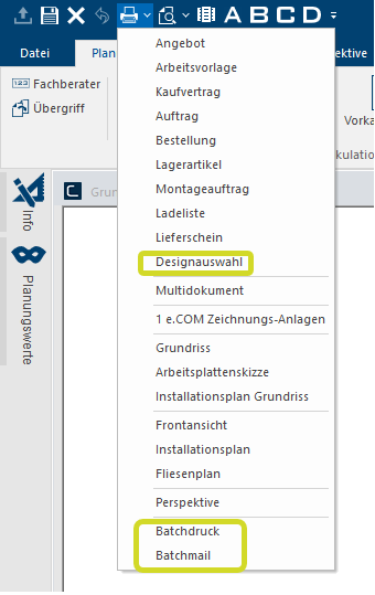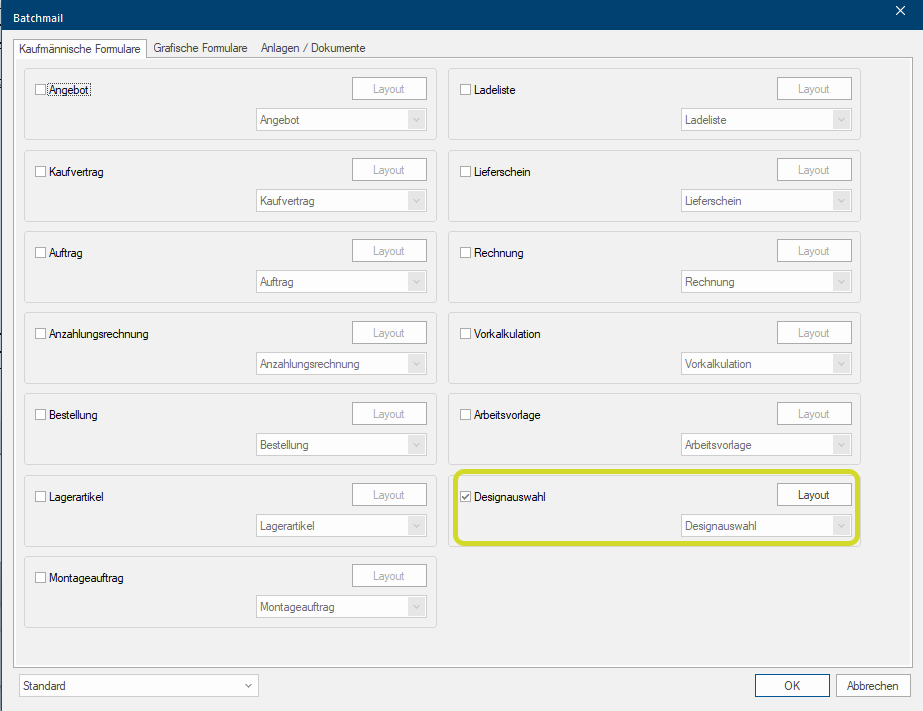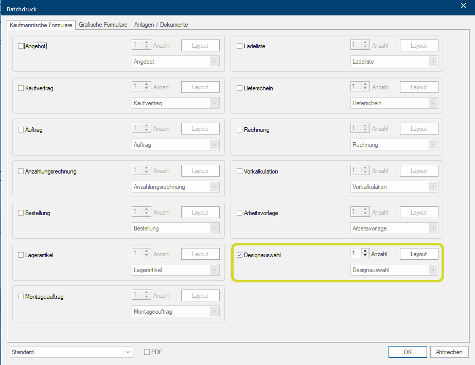 Le choix de design est désormais disponible sous forme de nouveau formulaire pour la sélection d'impression et peut être sélectionné dans l'impression batch et le batchmail.