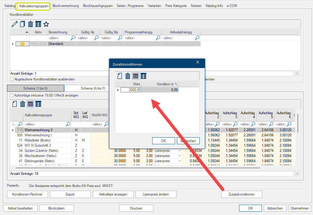 Nieuw | Aanvullende condities | Met de nieuwe Aanvullende condities dialoog kan, met een definieerbare IK-drempelwaarde, nu automatisch een extra korting worden toegepast, in het bijzonder om "grote keukens" prijstechnisch te ontlasten. |