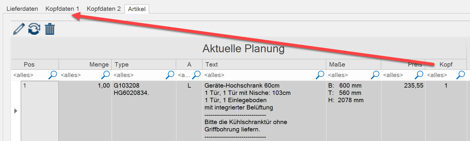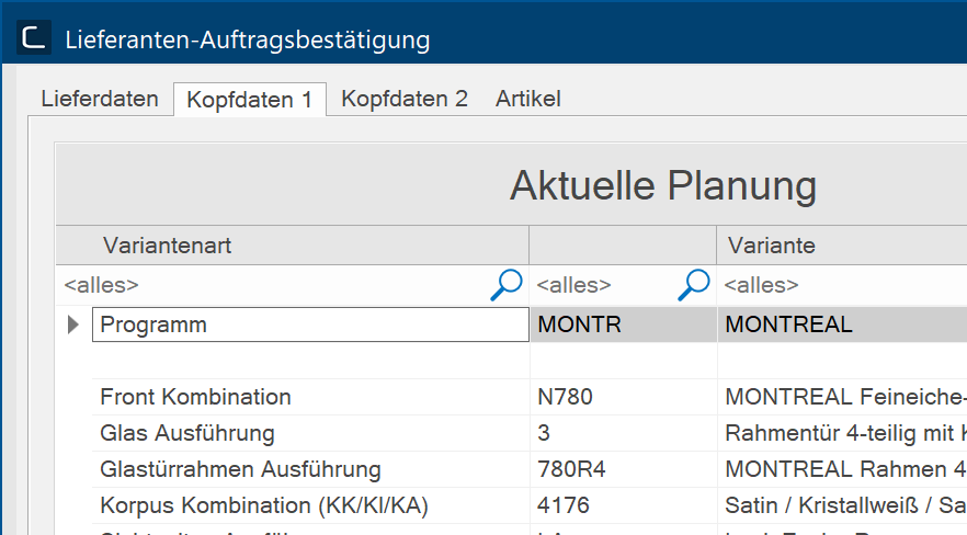 De OB-vergelijking is aangepast aan de nieuwe EDI Heden ten dage noemt men de overdracht van gegevens tussen computers via een medium, waarbij een extra protocol gebruikt wordt, de elektronische uitwisseling van gegevens (EDI). Het meest wordt gebruik gemaakt van EDI via het telefoonnet (ISDN/DSL). 3.x interface. In de Leveranciers-opdrachtbevestiging kunnen nu Meerdere hoofdgegevens Hoofdgegevens is in CARAT het hyperoniem voor alle gegevens die voor de weergave en de bestelling van een keuken nodig zijn. Dit zijn bijvoorbeeld het gekozen programma of de varianten zoals de uitvoering van de korpus uitvoering of de werkblad kanten. als tabblad getoond worden. Eveneens kunnen nu meerdere Hoofdgegevens via de interface overgedragen worden. Als er meerdere hoofdgegevens beschikbaar zijn, wordt op de artikelpagina de toewijzing aan de betreffende kop weergegeven. Als er slechts één kop beschikbaar is, wordt de kolom "Hoofdgegevens" verborgen. |
