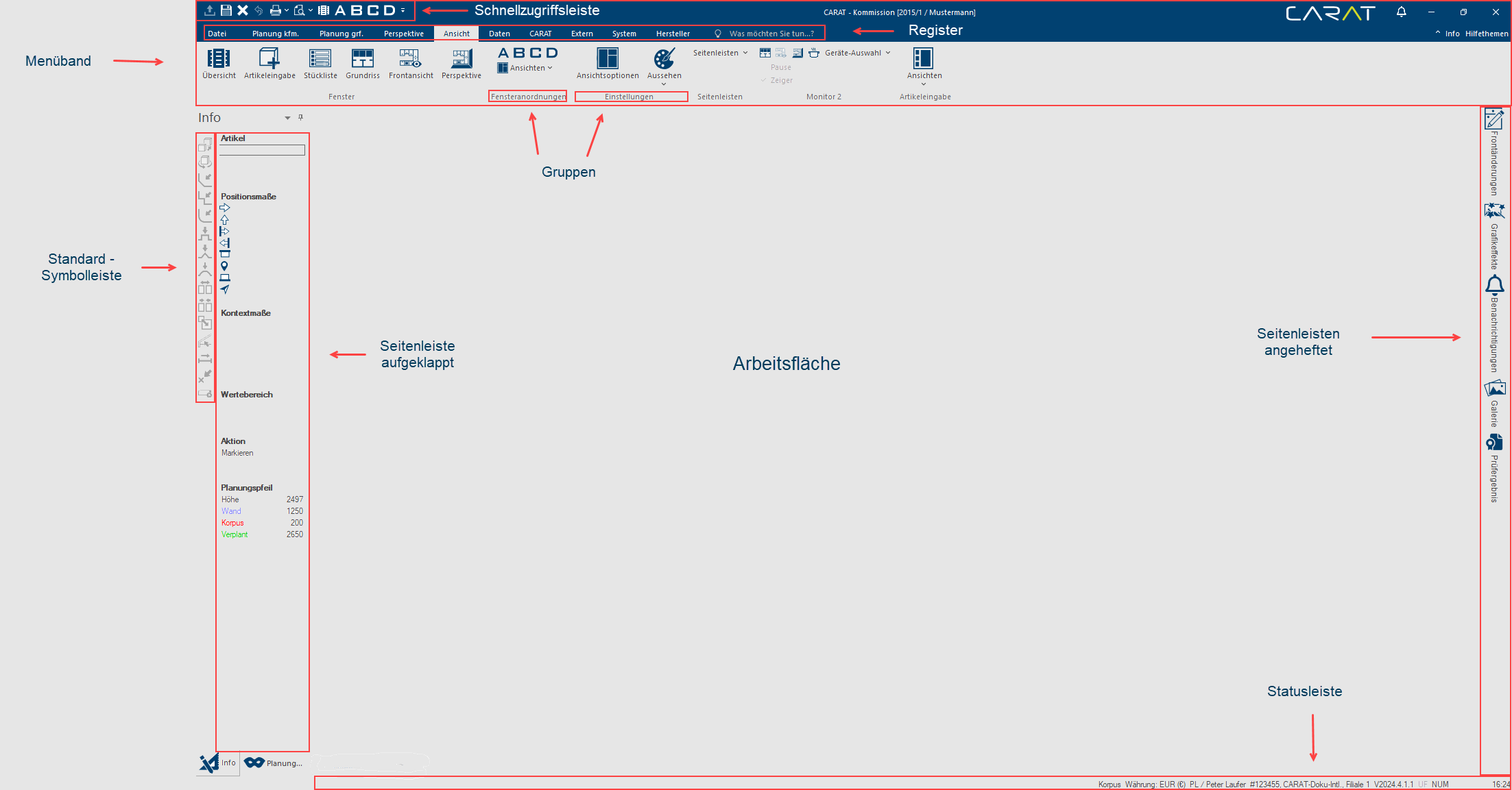 Het centrale element in de nieuwe interface van CARAT is de menubalk (Engels: Ribbonbar) in het bovenste gedeelte van het programma venster Programma´s en bestanden worden onder Windows (Engels= venster) in vensters weergegeven. In CARAT wordt voor ieder aanzicht (b.v. plattegrond, artikel invoer, frontaanzicht, perspectief enz.) een eigen venster geopend. Zo kan u verschillende vensters voor de bewerking tegelijk zien. Als in één venster iets veranderd wordt, heeft dit automatisch een uitwerking op alle andere vensters.. Daarin zijn - soortgelijk als in een conventionele menubalk - alle noodzakelijke functies gearrangeerd om CARAT te kunnen bedienen. Bij de menubalk gaat het om een grafisch bedien concept voor besturingsprogramma´s, dat de elementen menu controle, werkbalk en dialoog Speciale vensters in software-toepassingen worden dialoog, dialoog venster of dialoog veld genoemd. Dialoog vensters worden in verschillende situaties van de toepassing getoond om bepaalde invoer of bevestigingen van de gebruiker te verkrijgen. optimaal met elkaar verbindt.