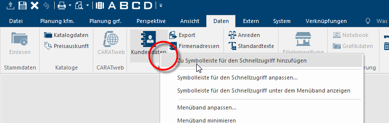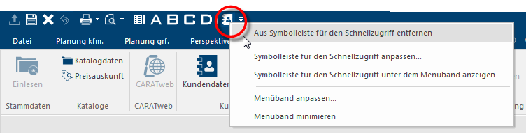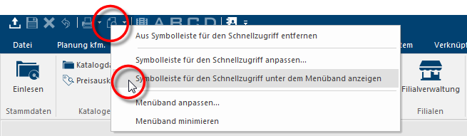 Klik met de rechtermuisknop op een van de symbolen in de snel toegang. Indien de snel toegang boven de menubalk geplaatst is dan kunt u via het contextmenu In bijna alle Windows-programma´s wordt door het klikken met de rechter muisknop een keuze menu geopend, waarin de commando's staan die zinvol zijn voor de volgende werkprocessen. uitkiezen dat de snel toegang onder de menubalk getoond moet worden.