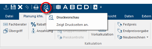Als u in de snel toegang direct op het symbool voor het Print voorbeeld klikt dan wordt het print voorbeeld voor het actuele aanzicht (plattegrond, stuklijst, front aanzicht,...) geopend.