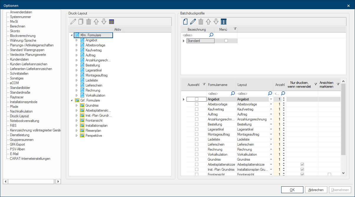 Door het gebruiken van batchafdruk-profielen kunt u de batchafdruk nog beter aan uw behoefte aanpassen. Met een batchafdruk-profiel kunt u formulieren, die u steeds nodig heeft voor een bepaald werkproces, zoals b.v. voor het maken van de offerte of voor de opdracht, vooraf samenstellen. Daardoor vervalt het individuele kiezen bij het oproepen van de batchafdruk. Alleen de muur- of perspectief-keuze moet nog worden gedaan, omdat deze steeds afhankelijk is van de betreffende planning.