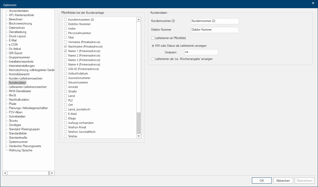 Op de pagina Klantgegevens kunt u in het linker gedeelte verplichte velden voor het aanleggen van nieuwe adressen definiëren. Bovendien kunt u de benaming van de beide velden klantnummer(2) en debiteurennummer hernoemen, alsook voorwaarden voor het tonen van de levertermijn vastleggen.