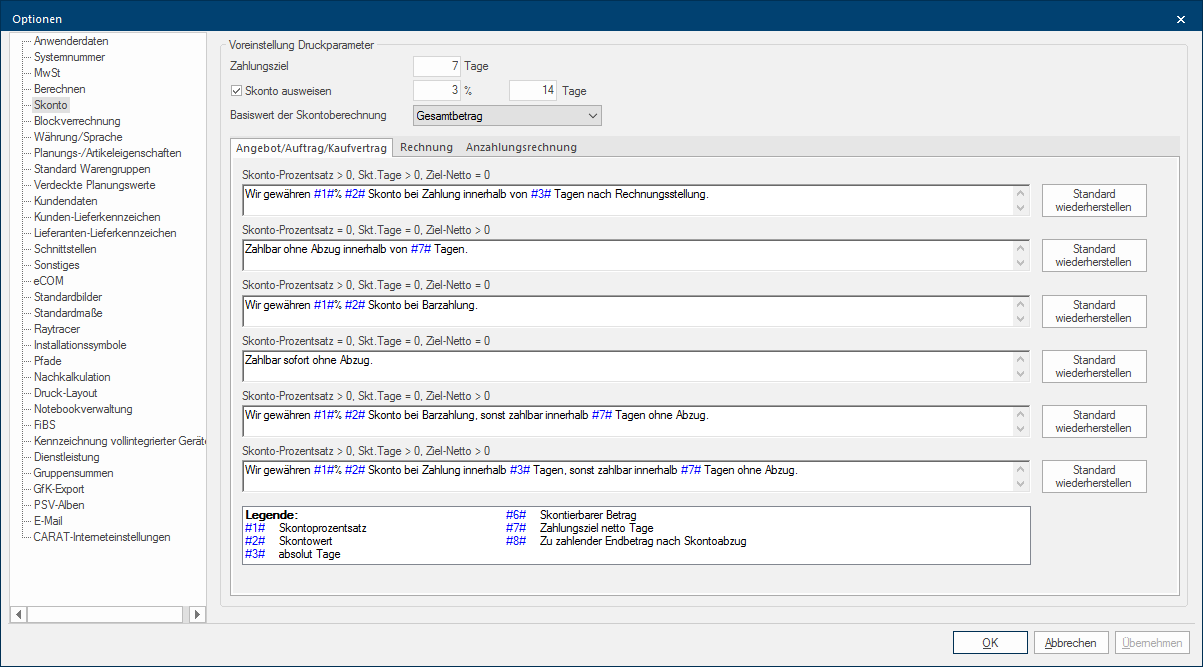 Op drie afzonderlijke tabbladen Sommige dialoog venster zijn zo veelomvattend dat de functies in sub-sectoren worden gedeeld. Deze sub-sectoren worden meestal in het bovenste gedeelte van de dialoog getoond en kunnen worden bereikt door te klikken op de betreffende tekst. heeft u voor de formulieren Offerte, Opdracht, Contract, Aanbetaling factuur en Factuur telkens zes invoervelden ter beschikking. Deze zijn nodig om, voor de verschillende mogelijkheden ter berekening van een betalingskorting, een passende standaardtekst te kunnen opslaan.