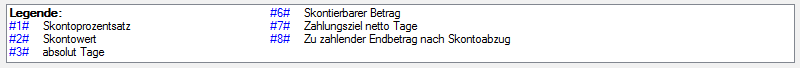 Onder de standaardteksten bevindt zich nog het gedeelte Legenda. Daar worden u alle Wildcards (#1#, #2#, ...) getoond, die u in de standaardteksten kunt gebruiken, om de reële waarden uit de betreffende planning bij het printen van een formulier automatisch over te nemen. Deze wildcards kunnen willekeurig in de teksten gecombineerd worden.