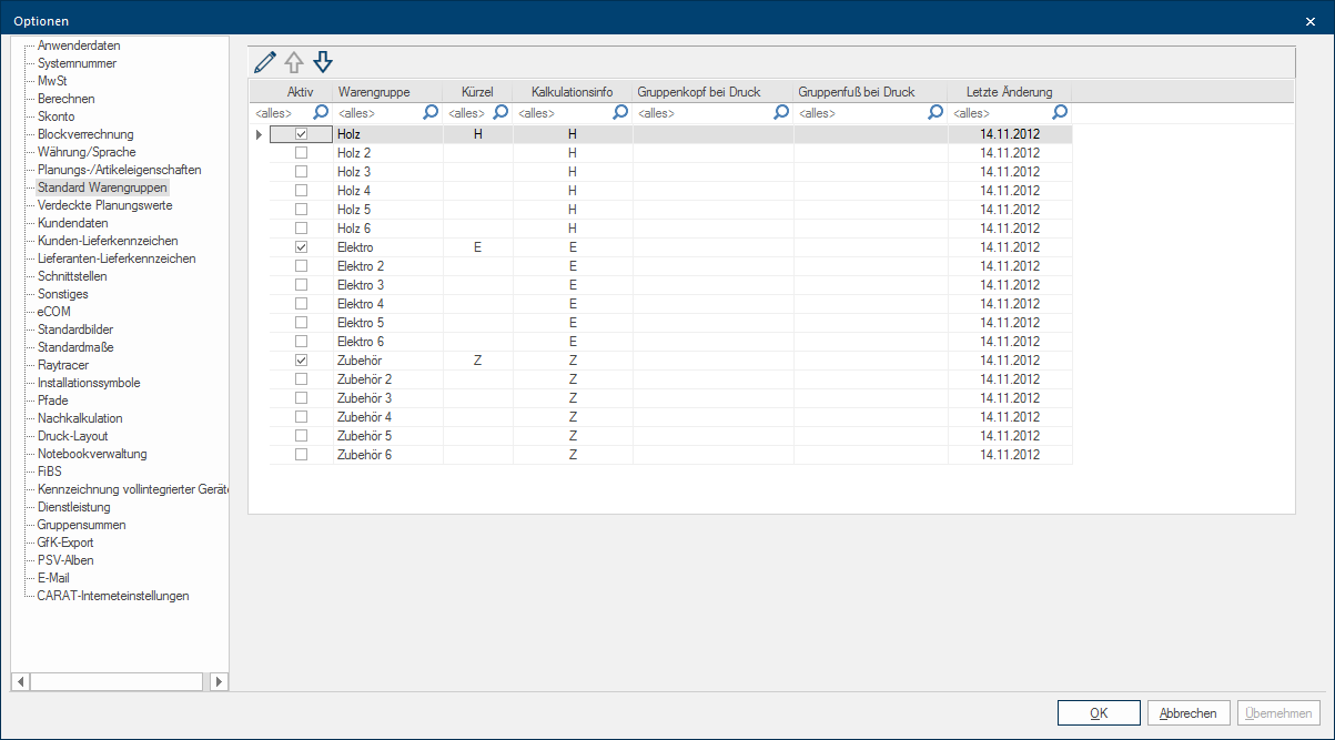 Via deze kolom kunt u zien welke standaard productgroepen op dat moment in CARAT gebruikt worden. |