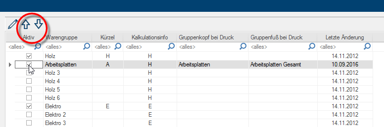 Nadat u de invoer heeft afgesloten, dient u de productgroep nog te activeren, zodat deze in CARAT gebruikt kan worden. Klik Voor zoverre niet anders aangegeven wordt de linker muisknop een keer kort gedrukt. Door het klikken wordt steeds een object gemarkeerd of bij het klikken op en knop, wordt de beschreven actie uitgevoerd (b.v. OK, Beëindigen, Sluiten). daarvoor in het aankruisvakje Het aankruisvakje (Engels: Checkbox) is een standaard element van een grafische gebruikersinterface. Een checkbox heeft meestal twee toestanden (aangekruist of niet aangekruist). Dit komt in het algemeen overeen met een ja/nee keuze. voor de gewenste productgroep. Middels de beide pijlen heeft u bovendien de mogelijkheid de volgorde van de productgroepen voor de commerciële documenten te veranderen. Markeer daarvoor de betreffende productgroep en verschuif de productgroep naar de gewenste positie door te klikken op de pijlen.