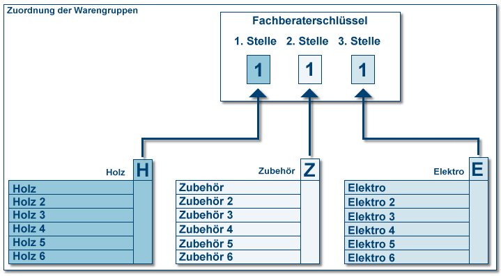 Het volgende schematische overzicht zal de toewijzing van productgroepen verduidelijken. Op het tabblad Sommige dialoog venster zijn zo veelomvattend dat de functies in sub-sectoren worden gedeeld. Deze sub-sectoren worden meestal in het bovenste gedeelte van de dialoog getoond en kunnen worden bereikt door te klikken op de betreffende tekst. Standaard productgroepen bevinden zich 18 productgroepen, waarbij steeds zes productgroepen in één standaard productgroep (H Hout, T Toebehoren, A Apparatuur) samengevat worden. Door de vaste verbinding aan één van de drie productgroepen wordt automatisch ook de toewijzing aan de betreffende positie van de adviseurs sleutel, een daarmee de te gebruiken factor gestuurd.
