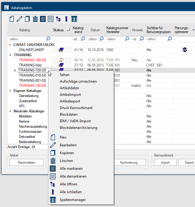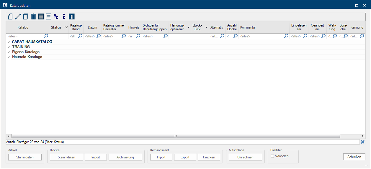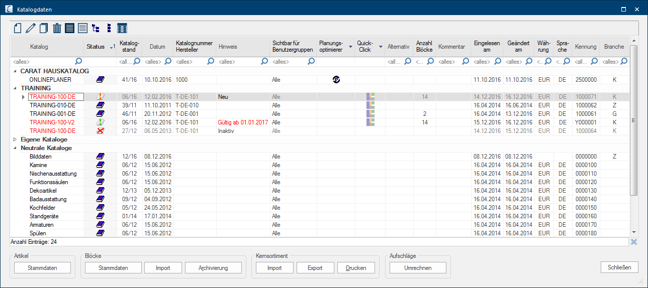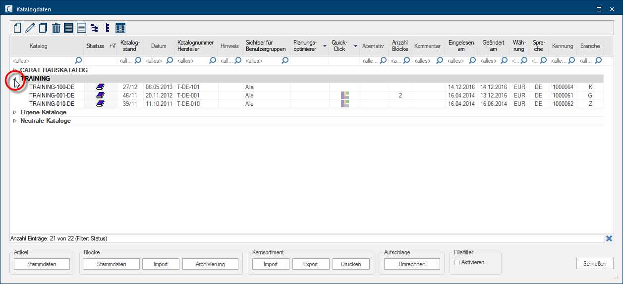 Hier kunt u de datum zien, wanneer u de catalogusversie in CARAT ingelezen heeft. | |
