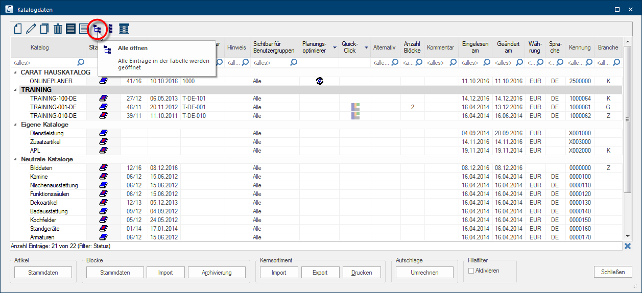 - Wanneer u snel alle groepen wilt openen, om alle catalogusversies te zien, dan kunt u ook in de werkbalk van de tabel de functie Alle openen uitkiezen.