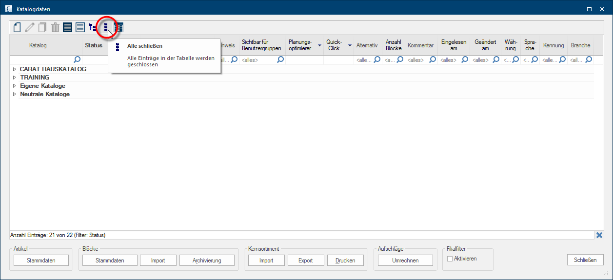 Via de knop Archivering kunt u de blokgegevens voor een gekozen catalogusversie op een gegevensdrager Een gegevensdrager is een gegevens opslag, vaak ook aspecifiek opslagmedium (voor gegevens) genoemd, en dient voor het opslaan van gegevens of informatie. opslaan of eerder gearchiveerde blokgegevens weer in CARAT inlezen. |