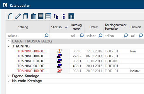 In de kolom Code wordt het door CARAT gegeven eenduidige nummer van de catalogusversie getoond. Heeft u een catalogus via de kopieerfunctie gekopieerd, dan wordt de code voorafgegaan door een Y, bij een zelf aangelegde catalogus door een X. | |